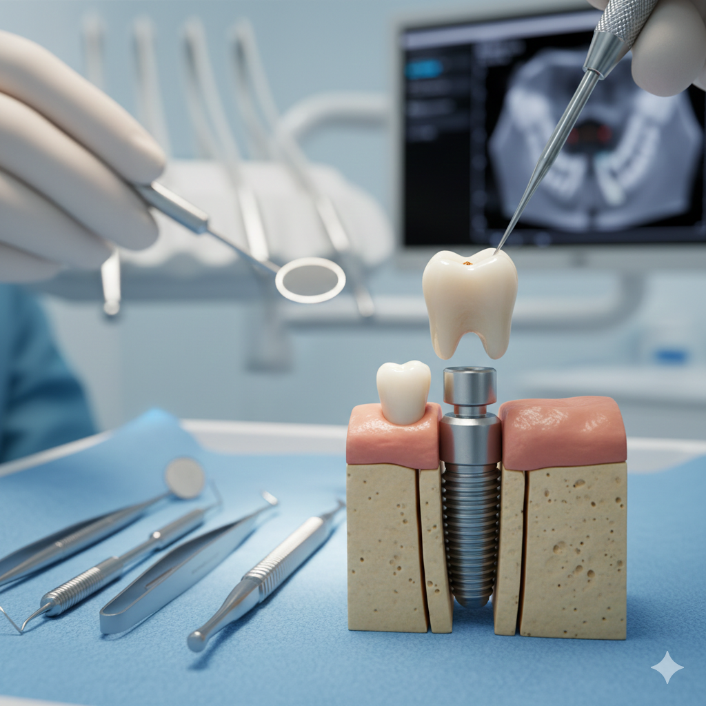 El Implante (Cuerpo): Un pequeño tornillo fabricado generalmente de titanio (o circonio) que se inserta en el hueso maxilar. Es biocompatible, lo que permite que el hueso se fusione con él.